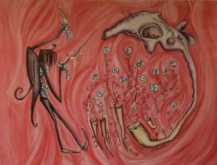 Extraordinary is the aura of mystery and tension of the series The tales adult (watercolor and acrylics on canvas, June 2009) obtained from desolate scenery and everyday objects, but used in an unusual way. In the artwork “La ballerina”, the woman’s body and her position crushed to floor, resembles the shape of an insect ready to hole up at the first sign of danger.
